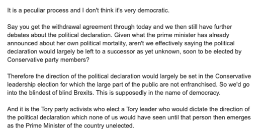 The removal of the political declaration (PD) from the vote is fascinating – and something we didn’t expect at all. Proof that the “ties” in charge of UK inc still have it (up their sleeve). It was necessary in order the “sneak” the same old rope – the Withdrawal agreement (WA) – past the Speaker. But it’s far more sinister.